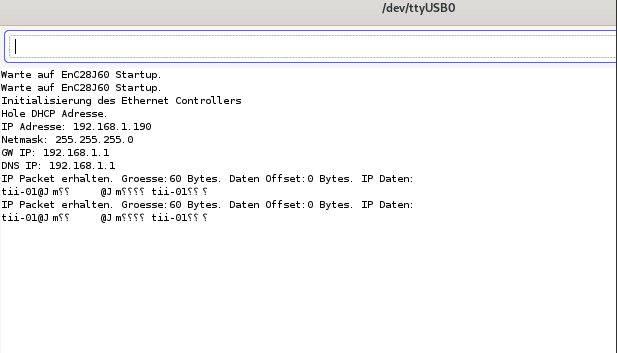 In dem nebenstehenden Video kann man sehen, wie der Netzwerk Adapter initialisiert wird, sich seine IP Adresse und die weiteren Netzwerkinformationen per DHCP holt und anschließend die eingehenden Datenpakete über die serielle Konsole ausgibt.