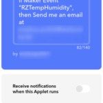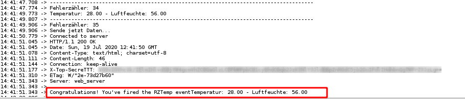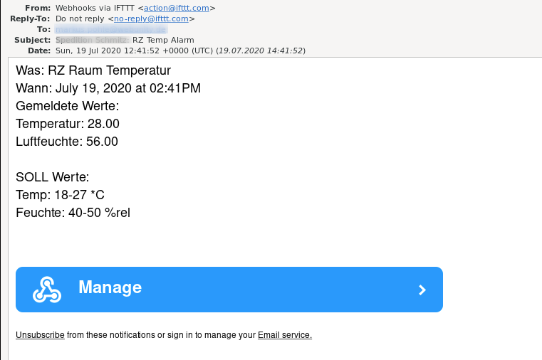 Nach dem Initialisieren des ENC28J60 Netzwerk Moduls und des DHT11 Sensors (in der setup() Routine) durchläuft der Sketch „unendlich“ die loop() Routine. Dabei liest er zunächst die Daten aus dem DHT11 Sensor aus. Sollte es hierbei zu einem Fehler kommen, wartet der Sketch 5 Sekunden und springt dann aus der weiteren Verarbeitung raus, um die loop() Routine von vorne zu beginnen. Anschließend werden die gemessenen Werte mit den Schwellwerten für Temperatur und Luftfeuchte verglichen. Ich habe mich bei diesen Grenzwerten an den üblichen Grenzwerten für Rechenzentrums-Räume orientiert und nach oben und unten ein wenig Spielraum dazu gegeben, speziell bei der Luftfeuchtigkeit. Kommt es zu einer Schwellwertüberschreitung, dann wird ein Counter um eins nach oben gezählt. Erreicht der Counter dabei einen Wert, welcher einem dauerhaft überschrittenen Schwellwert von einer Minute entspricht, dann wird ein HTTP GET Request zum Aufruf der ifttt.com Seite zusammen gebaut und abgesetzt – die Messwerte werden dabei natürlich als Parameter mit an die URL angehängt. Dabei wird ein weitere Counter gesetzt. Dieser Counter dient dazu, zu prüfen, ob zwischen den HTTP GET Requests mindestens 10 Minuten Zeit liegen – damit soll verhindert werden, dass der Webhook bei IFTTT im Minutentakt aufgerufen wird. Sollten die Schwellwerte nicht mehr überschritten sein, dann wird der entsprechende Counter wieder auf eins zurück gesetzt. Im Screenshot unten seht ihr einen erfolgreich abgesetzten Request gegen die ifttt.com Schnittstelle. Im Screenshot darunter könnt ihr die von IFTTT generierte Email mit den übergebenen Messwerten sehen.